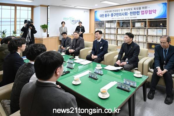 대전 중구(구청장 김제선)는 지난 5일 중구 한의사회 및 전한련(전국 12개 한의과대학 한의학전문대학원 학생회연합)과‘주민 건강증진 및 한의학도 육성을 위한 업무협약’을 체결했다고 밝혔다.