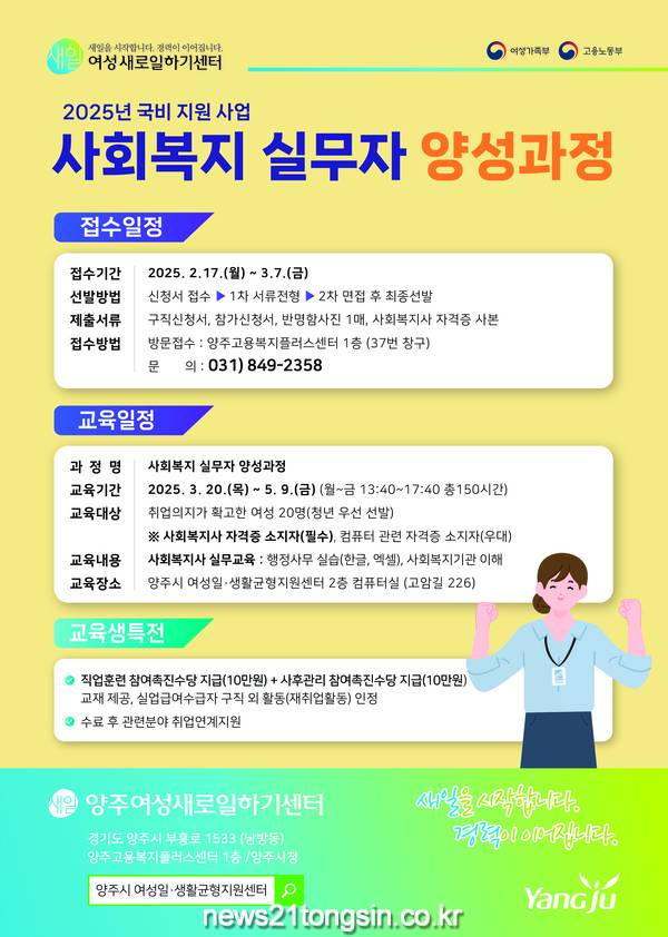 교육을 희망하는 여성은 구직 신청서와 참가신청서, 반명함 사진 1매 및 사회복지사 자격증 사본을 지참해 양주고용복지+센터 1층 양주여성새로일하기센터로 방문 신청하면 된다.