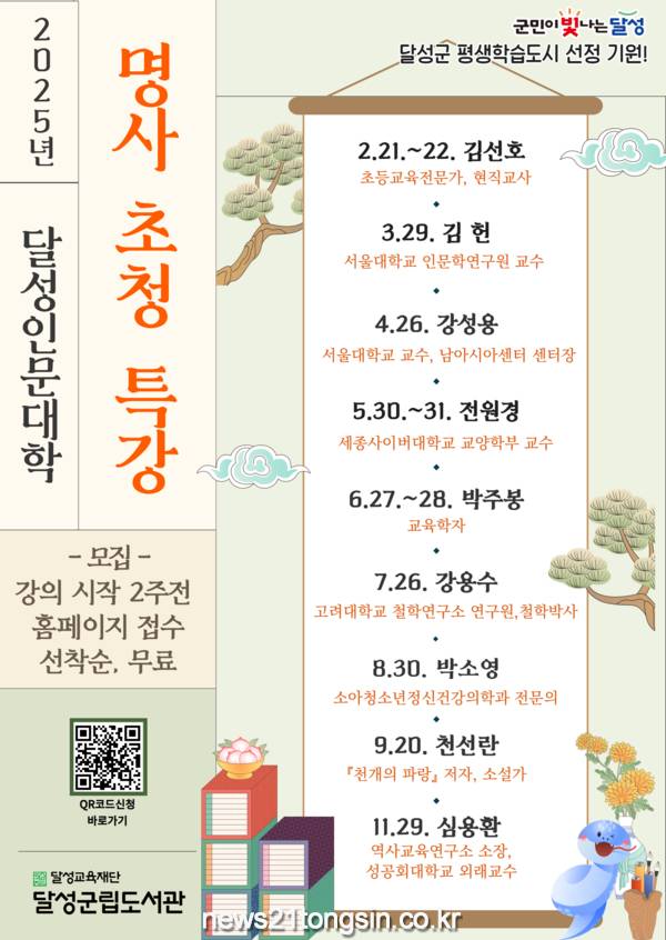 (뉴스21통신/홍미희기자) = 이달 21일부터 11월 29일까지 2025년 달성인문대학 ‘명사 초청 특강’을 진행한다고 달성군립도서관(이사장 최재훈)은 밝혔다.