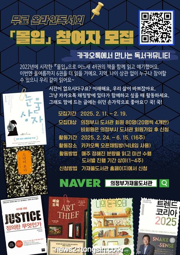 참여 신청은 2월 11일 오전 10시부터 19일까지 가재울도서관 누리집(www.uilib.go.kr/gajaeul)에서 가능하며, 읽을 책은 참가자가 직접 준비하면 된다. 자세한 사항은 가재울도서관 누리집 또는 가재울도서관(031-828-8662)에서 확인할 수 있다.