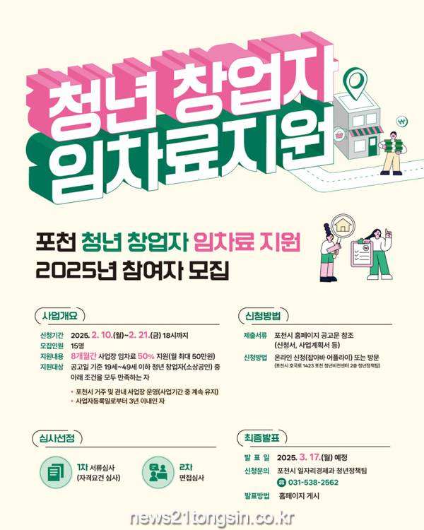 ▲ 사진=포천시포천시(시장 백영현)는 오는 10일부터 21일까지 청년 창업자의 안정적인 정착을 위해 ‘2025년 청년 창업자 임차료 지원사업’을 신청받는다.