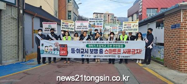전남 구례군은 개학기를 맞아 지난 21일 구례북초등학교 정문에서 구례군청, 구례경찰서, 전라남도구례교육지원청, 구례북초등학교, 녹색어머니회와 합동으로 학교 주변 위해 요인에 대해 집중 단속을 실시하고 합동 교통안전 캠페인을 펼쳤다.