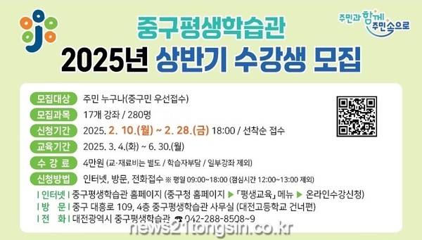 대전 중구(구청장 김제선)는 이달 말까지 2025년 상반기 중구평생학습관 프로그램 수강생을 선착순 모집한다고 10일 밝혔다.
