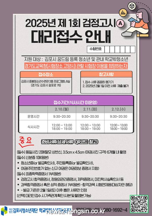 검정고시는 4월 5일(토) 시행될 예정이며, 접수를 희망하는 청소년 및 보호자는 김포시청소년재단 중봉청소년수련관 2층 프로그램5,6실에서 신청할 수 있다. 이번 대리 접수는 김포시 학교밖청소년지원센터에 등록된 청소년 및 관내 학교 밖 청소년 대상으로 진행되며, 미등록 청소년도 대리 접수 후 센터 등록 절차를 거쳐 지원을 받을 수 있다.