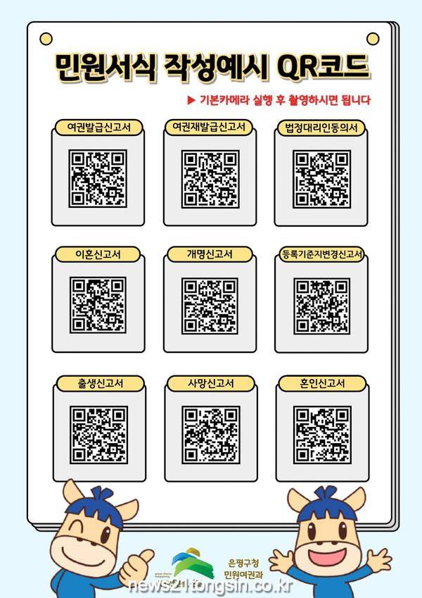 은평구(구청장 김미경)는 민원인의 서식 작성 편의를 돕고 신속한 민원 서비스를 제공하기 위해 ‘민원 서식 작성 예시 큐알(QR)코드’를 제작해 배포한다고 밝혔다.
