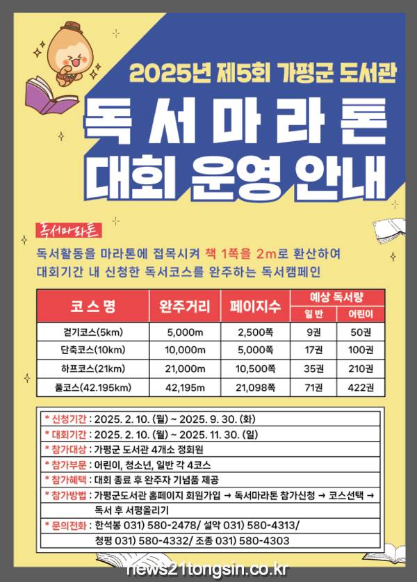 온라인으로 치러지는 독서마라톤 대회는 이달 10일 시작으로 11월 30일까지 약 10개월간 운영된다. 신청은 가평군도서관 정회원으로, 가평군 도서관 홈페이지(https://www.gaplib.go.kr/marathon)에서 9월 30일까지 신청할 수 있다.