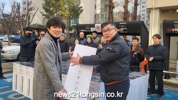 ▲ 오늘(2월11일) 오후2시 동두천송내주공5단지 앞에서 난방기기 전달식을 가졌다오늘(11일) 오후 2시 동두천 송내주공5단지 관리사무소 앞에서는 지은지 오래된 아파트의 열악한 환경의 경비실에서 근무하는 경비원들을 위해 난방기를 전달하는 행사가 있었다.
