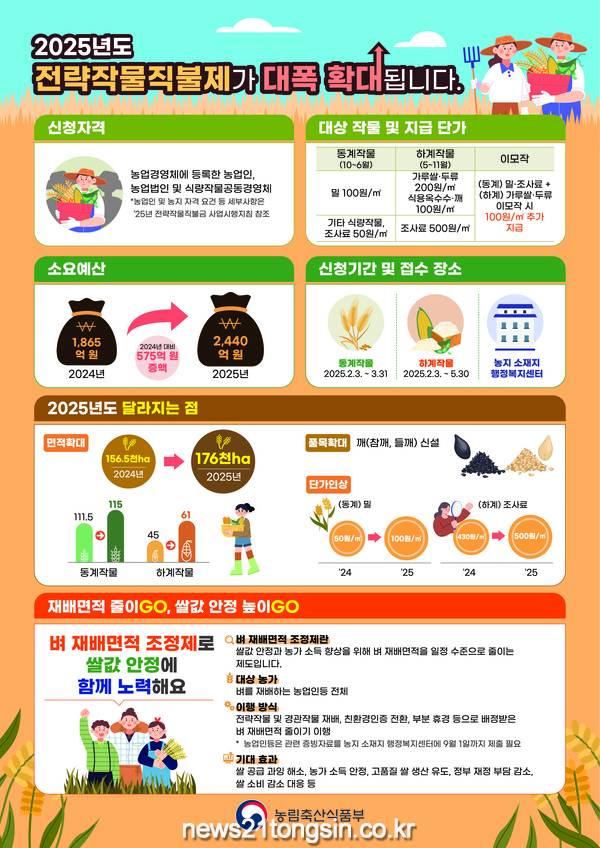 동계작물은 3월 31일까지, 하계작물은 5월 30일까지로 작물별 일정에 따라 각각 신청 기간 내 전략작물 직불금 신청 면적이 가장 넓은 읍·면·동 행정복지센터 산업팀에서 접수해야 한다.