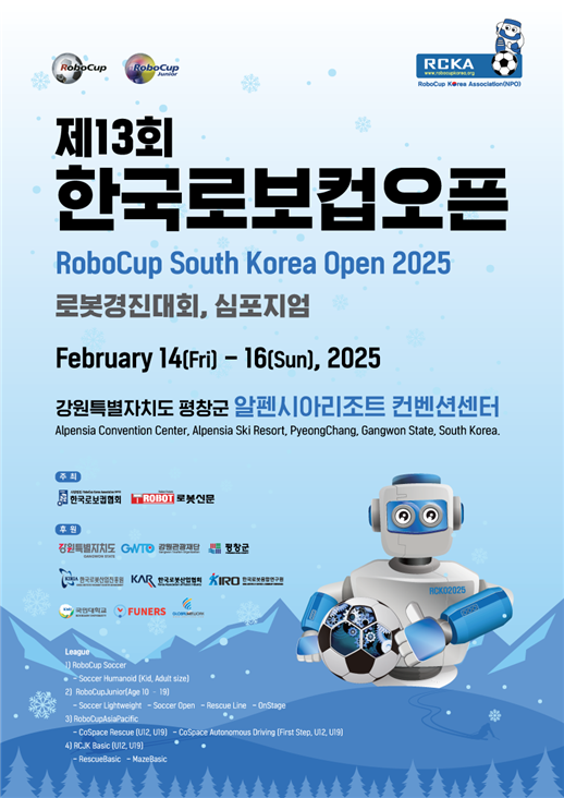 강원관광재단(대표이사 최성현)은 제13회 한국 로보컵 오픈(RoboCup South Korea Open 2025, RCKO 2025)이 2월 15일(토) 평창 알펜시아 리조트에서 개막한다고 밝혔다.