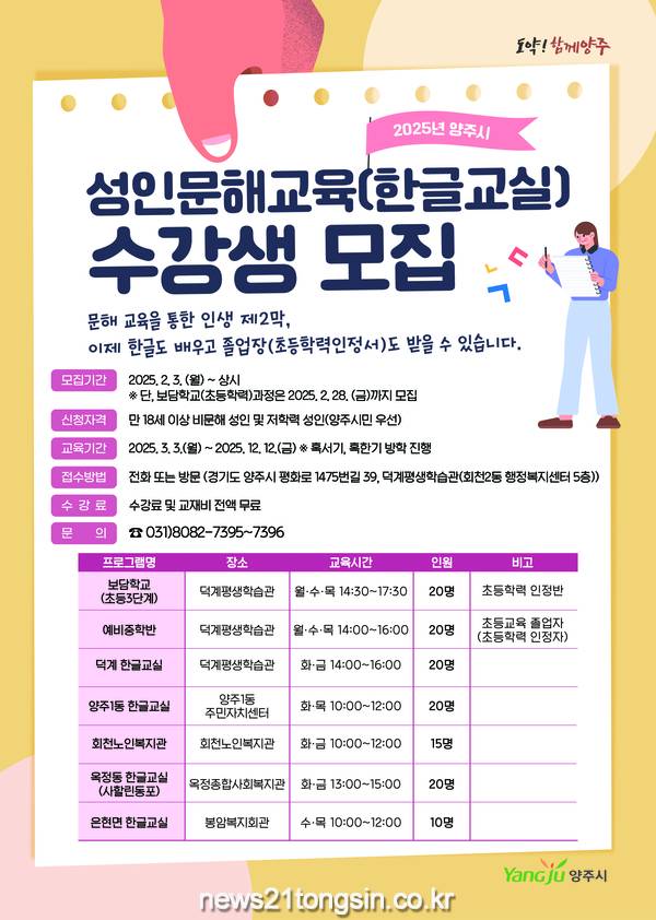▲ 사진=양주시양주시(시장 강수현)가 ‘2025년 성인문해교육(한글교실) 지원 사업’의 수강생을 상시 모집한다고 12일 밝혔다.