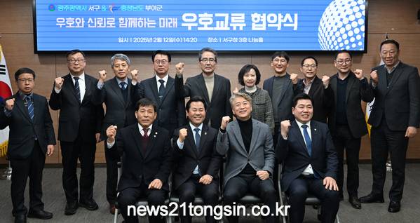 ▲ (사진) 광주 서구·충남 부여군, 우호교류‘맞손’ (협약식)광주광역시 서구(구청장 김이강)와 충남 부여군(군수 박정현)이 12일 서구청에서 상생 발전을 위한 우호교류 협약을 체결했다.