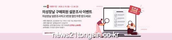 2월 10일부터 2월 28일까지 의성장날(https://esmall.cyso.co.kr) 이용 고객들의 소중한 의견을 듣고 쇼핑몰 운영에 반영하여 더 나은 서비스를 제공하고자 소비자 설문조사를 진행하는데, 참여하는 구매 고객 선착순 1,000명에게 5,000원 할인쿠폰을 발행할 예정이다.