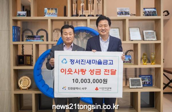 인천 서구(구청장 강범석)는 10월 29일, 정서진새마을금고(이사장 윤의상)로부터 이웃돕기 성금 1,000만 3천원을 전달받았다.