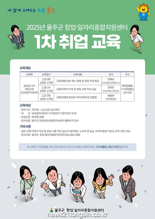 (뉴스21통신/우정석기자) = 울산시 울주군이 오는 21일까지 웅촌면에 위치한 울주군 창업·일자리종합지원센터에서 공공일자리분야 취업 교육생을 모집한다고 17일 밝혔다.