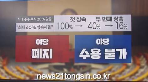 여당은 첫 상속 때 주식의 40%로, 두 번째 때는 16%로 쪼그라드니 기업의 상속 부담을 줄여주기 위해 할증 제도를 없애자는 입장인데, 야당은 기업의 사회적 책임을 강조하며 수용 불가 입장이다.