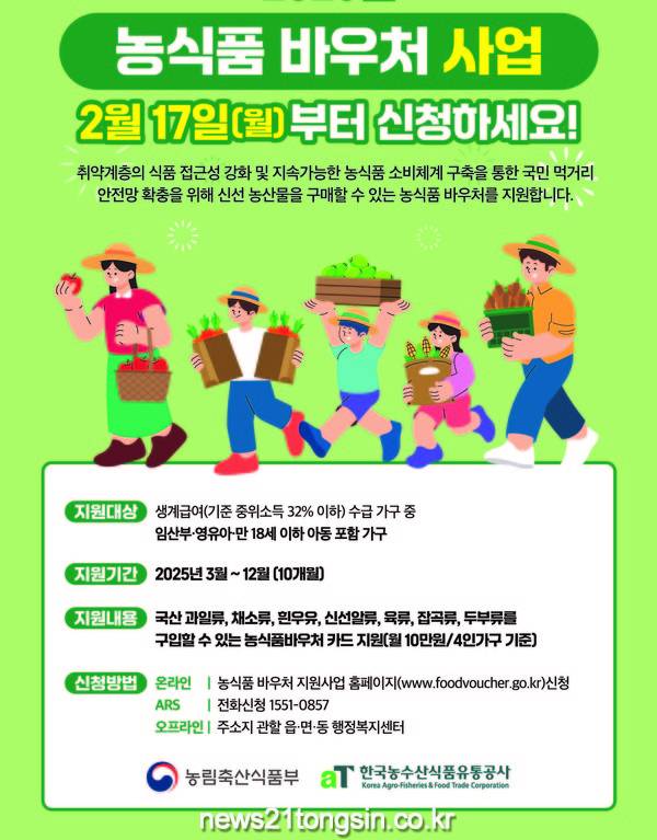 농식품 바우처 지원 신청은 온라인(www.foodvuocher.go.kr), ARS(1551-0857) 또는 각 주소지 읍·면·동 행정복지센터에서 신청이 가능하다.