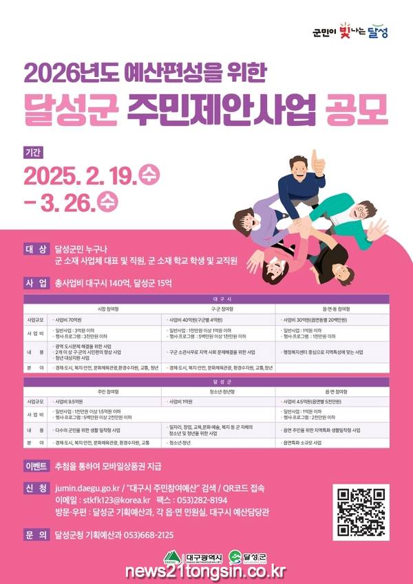 (뉴스21통신/홍미희기자) = 주민제안사업 공모는 예산편성 과정에 주민들의 참여를 보장하고 실제 주민들이 원하고 지역 특색에 맞는 사업 아이디어를 정책에 반영하여 재정 운영의 투명성과 민주성을 높이기 위한 제도로서 달성군(군수 최재훈)은 2026년 주민참여예산편성을 위한 2025년 주민제안사업을 2월 19일부터 3월 26일까지 공모하여 사업부서의 타당성 검토와 위원회의 검토, 주민투표를 거쳐 공모된 사업은 2026년 예산에 반영된다.