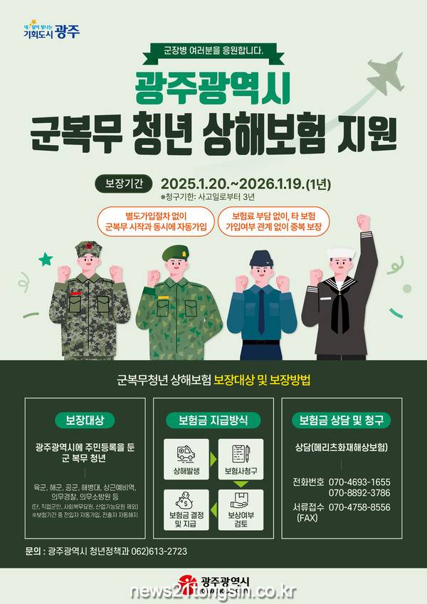 광주광역시는 올해도 광주청년들이 국방의무에 전념할 수 있도록 ‘군복무 청년 상해보험’ 가입을 지원한다.