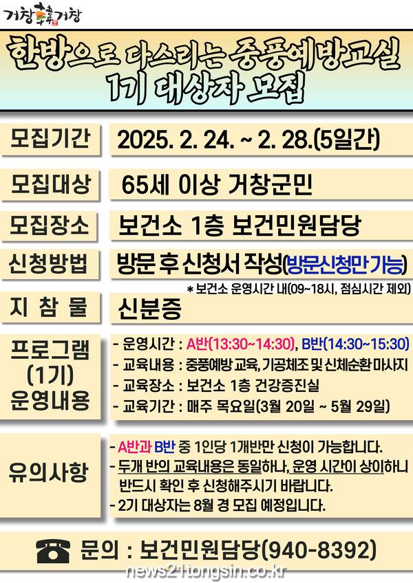 거창군은 관내 65세 이상 군민들을 대상으로 뇌졸중을 선제적으로 관리하고 예방하기 위한 한의약 건강증진 프로그램인 ‘한방으로 다스리는 중풍예방교실’ 1기 대상자를 오는 24일부터 28일까지 5일간 선착순 모집한다고 19일 밝혔다.