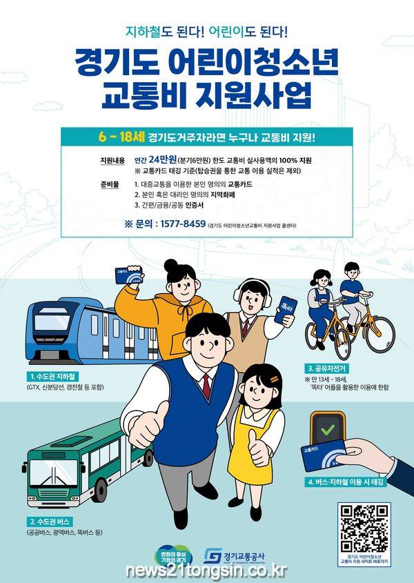 경기도는 6~18세 도민을 대상으로 분기별 6만 원, 연간 최대 24만 원 한도 내에서 실사용 교통비를 전액 지원하는 정책을 운영 중이다. 지원 대상 교통수단은 수도권 지하철(GTX·신분당선·경전철 포함), 수도권 버스(공공·광역버스 등), 공유자전거다. 버스와 지하철은 교통카드 태깅을 통해 이용하면 되지만, 공유자전거는 13~18세 청소년이 ‘똑타’ 애플리케이션을 통해 사용한 내역만 인정된다.