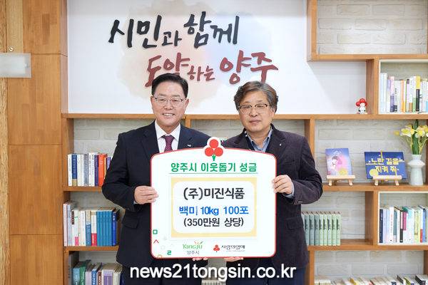 한편, ‘㈜미진식품’은 관내 광적면에 소재한 식품 제조 기업으로 매년 이웃돕기 성품을 기부하는 등 꾸준히 지역사회에 따뜻한 마음을 전달해 오고 있다.