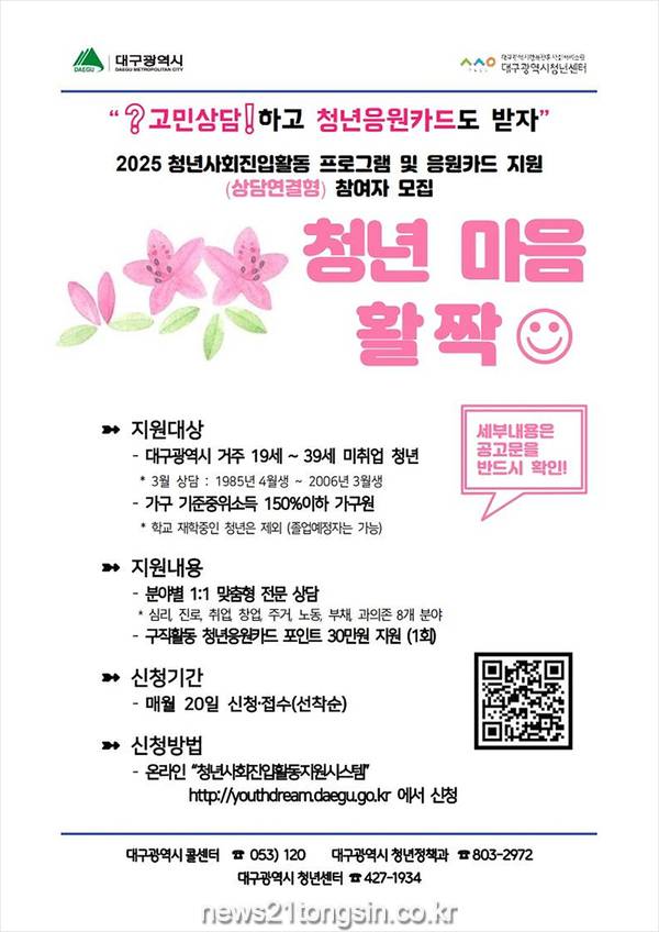 대구광역시는 어려운 경제 여건 속에서도 사회진입을 위해 노력하는 지역청년들을 응원하고, 직면한 고민을 함께 나누기 위해 ‘2025년 청년사회진입 활동지원사업’을 추진하고 참여자를 모집한다.