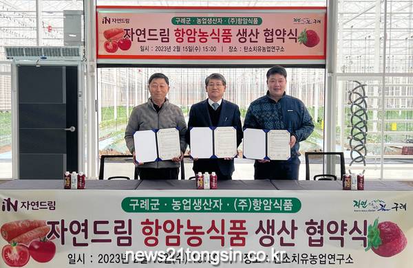 전남 구례군과 농업생산자, 농업회사법인 ㈜항암식품은 15일 탄소치유농업연구소에서 자연드림 항암 농식품 생산을 위한 협약식(MOU)을 개최했다.