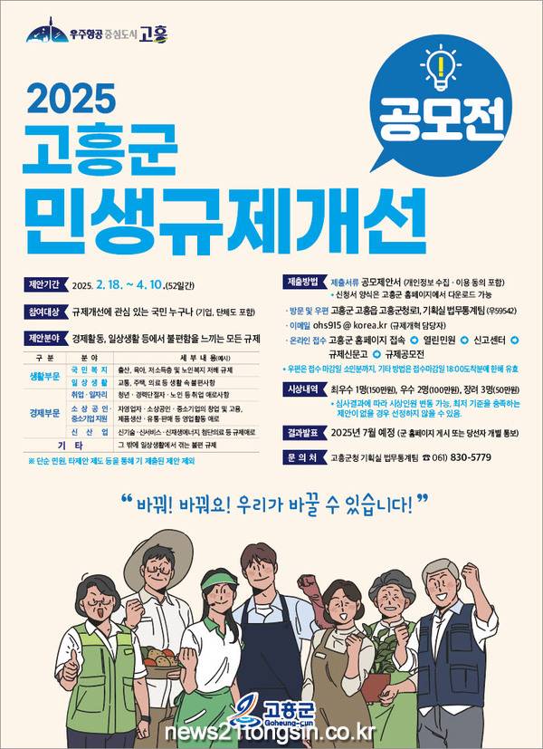 고흥군(군수 공영민)은 2월 18일부터 4월 10일까지 군민의 일상생활과 기업 활동에 불편을 주는 불합리한 규제를 발굴·개선하기 위해 ‘2025년 민생규제 개선과제 공모전’을 개최한다고 밝혔다.