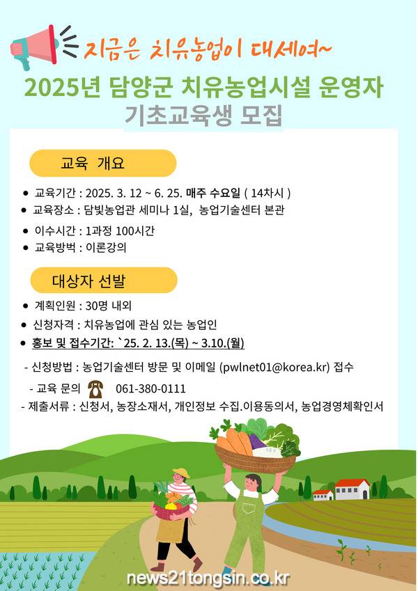 담양군은 치유농업에 대한 이해와 체계적인 치유농업 서비스 제공을 위한 ‘치유농업시설 운영자 교육’을 오는 3월부터 6월까지 운영한다.