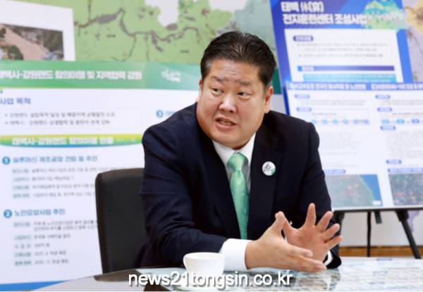 “태백은 7∼80년대 석탄에너지로 급팽창했다. 1989년 석탄합리화, 1990년대 석유에너지로 전환되면서 탄광 50개가 문을 닫았고, 13만 인구가 3만8000명으로 급감했다. 현재 석유에너지에서 무탄소 에너지로 전환되는 출발점에 서 있다.태백이 석탄에서 무탄소 에너지로 전환되는 세계 첫 번째 사례다. 카본 프리(탄소 배출 제로, carbon free)를 선도하는 글로벌 도시를 만들겠다. 제1차 태백경제개발 5개년 계획을 오는 2027년까지 추진하는데, 에너지 대전환이 핵심이다.