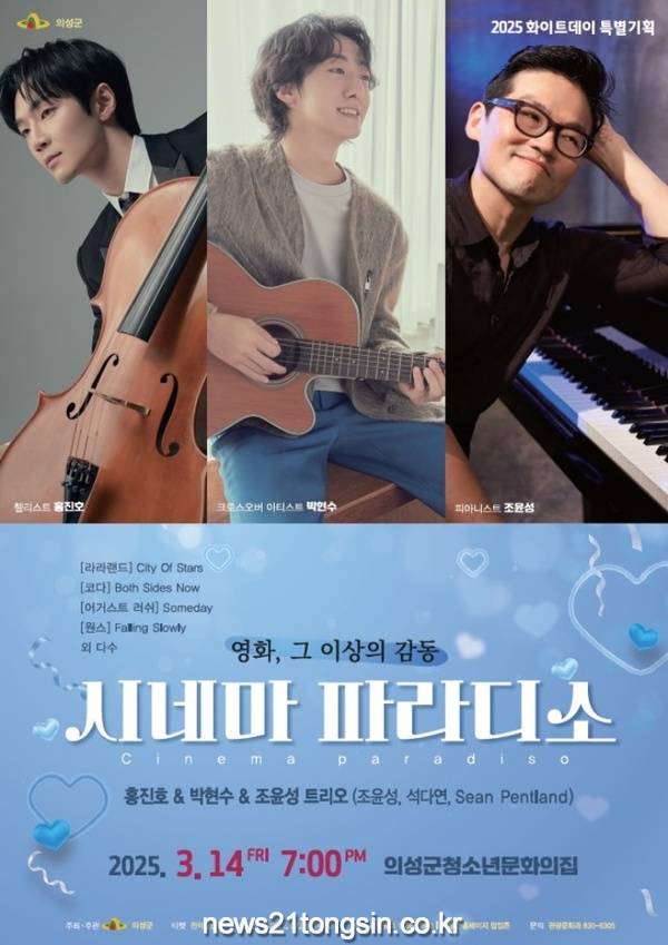 의성군(군수 김주수)은 첼리스트 홍진호, 크로스오버 아티스트 박현수, 피아니스트 조윤성트리오(조윤성, 석다연, Sean Pentland)가 함께 꾸미는 화이트데이 특별 기획공연 <</span>시네마 파라디소>를 오는 3월 14일(금) 저녁 7시, 의성군청소년문화의집에서 개최한다고 밝혔다.