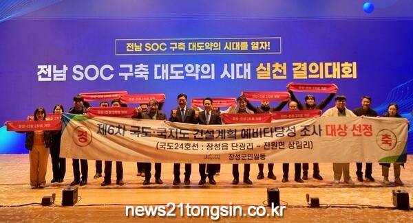 사업 구간은 장성읍 단광리에서 진원면 상림리까지 이어지는 국도로 경사가 높고 길이 휘어져 있어 통행에 불편이 따른다.장성군은 지역민의 의견을 수렴해 민선8기 출범 직후인 2022년 7월 국토교통부 익산지방국토관리청 등 관련기관 협의를 거쳐 2023년 ‘6차 국도‧국지도 건설계획 대상지’를 국토부에 제출했다.그 결과, 올해 1월 기획재정부 재정사업평가위원회 일괄예비타당성 조사 대상에 선정되는 성과를 냈다.추후 국비 627억 원을 투입해 해당 5km 구간의 도로 폭을 넓히면, 교통사고 위험을 낮추고 이동 편의성을 확보하게 된다.김한종 장성군수는 “지역민 숙원사업인 국도 24호선 개량이 차질 없이 진행되어 뜻깊다”면서 “대규모 개발사업을 시행 중인 첨단3지구와의 원활한 연결로 지역경제 성장에 일조할 것”이라고 전망했다.한편, 김한종 군수는 지난 19일 전남지역 16개 지역 시장‧군수 등 300여 명이 참석한 ‘전남 SOC(에스오씨) 구축 대도약의 시대 실천 결의대회’에서 결의문 제창, 공동 건의서 서명 등에 동참하며 사회기반시설 구축 의지를 다진 바 있다.
