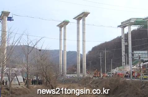 고속도로를 잇는 교량 작업 중 교각 상판 구조물이 무너지는 사고가 난 거다.