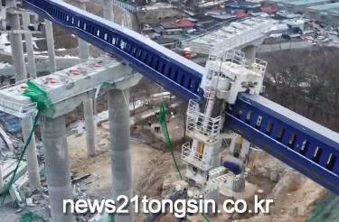이곳에서 '런쳐'라는 크레인이 쓰였는데, 교각 위 상판의 뼈대가 될 '빔'을 옮겨 놓는 건설 기계다.