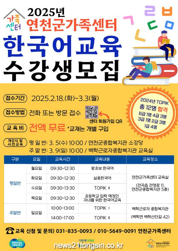 올해는 2024년 한국어교육 만족도를 반영, 전곡읍에서는 왕초보 한국어반, 실용 한국어반, 토픽 심화반(Ⅱ), 자녀학습을 위한 한국어반이, 백학면에서는 토픽 기초반(Ⅰ), 토픽 심화반(Ⅱ)이 진행될 예정이다. 해당 프로그램들은 연천군가족센터 홈페이지 혹은 방문 접수를 통해 신청 가능하다.