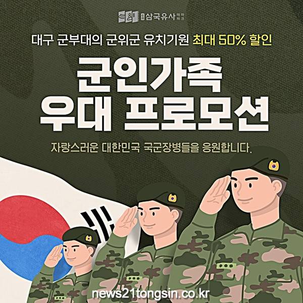 ‘군인가족 우대 프로모션’은 행사기간 중 삼국유사테마파크를 방문하는 군인(현역군인, 군무원, 사관생도, 학군단 등) 본인 및 동반 3인까지 최대 50% 할인 혜택이 주어진다.
