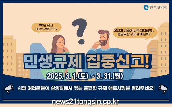 인천광역시(시장 유정복)는 시민이 직접 체감할 수 있는 규제혁신을 추진하기 위해 3월 한 달간 ‘민생규제 집중신고기간’을 운영한다고 밝혔다.