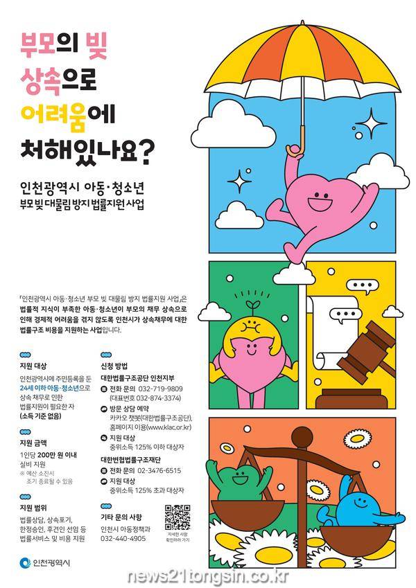 이번 지원은 인천시에 주민등록을 둔 24세 이하 아동·청소년을 대상으로 하며, 상속채무로 인해 법률지원이 필요한 경우 소득 기준 없이 누구나 신청할 수 있다.