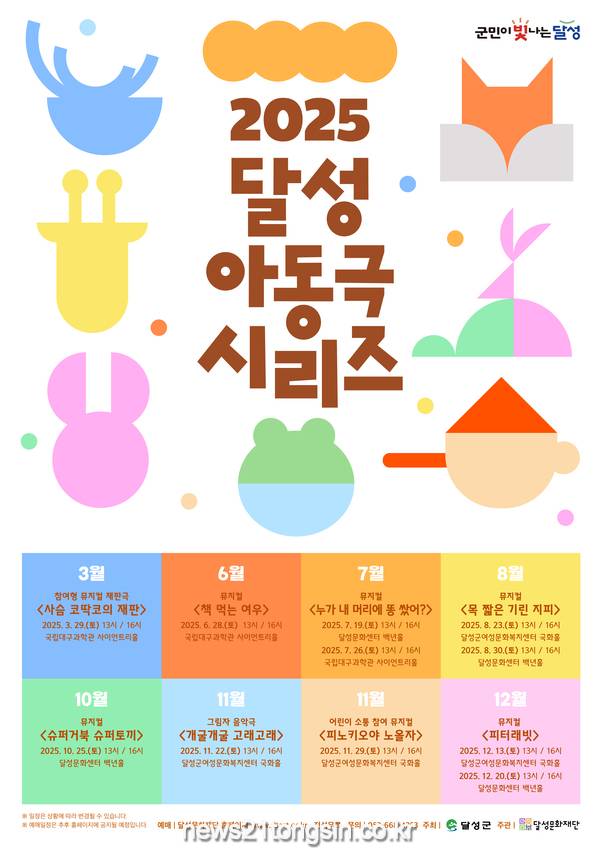 (뉴스21통신/홍미희기자) = 어린이들에게 문화적 혜택을 제공하고, 가족이 함께하는 여가문화를 조성하기 위해 준비한 ‘2025년 달성 아동극 시리즈3월부터 선보인다고 ()달성문화재단(이사장 최재훈)은 밝혔다.