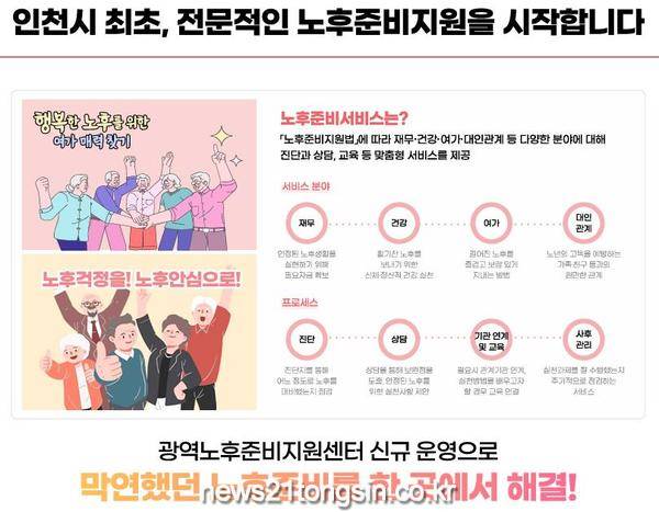 이를 위해 인천광역시(시장 유정복)는 시민들의 체계적인 노후 준비를 위한 광역노후준비지원센터로(이하 센터) 인천고령사회대응센터(센터장 박정숙)와 국민연금공단 남동연수지사(지사장 이상욱)를 지정하여 운영한다고 밝혔다.
