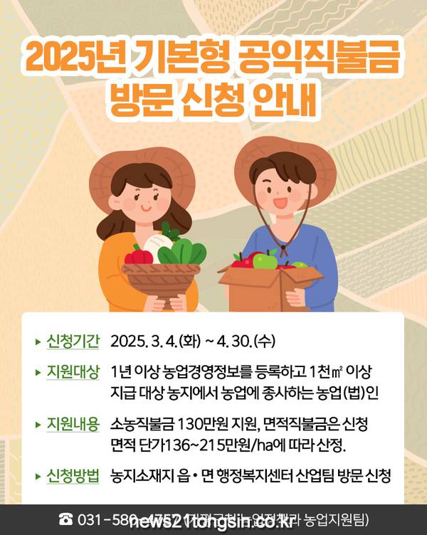 ▲ 사진=가평군가평군(군수 서태원)이 2025년 기본형 공익직불금 방문 신청을 이달 4일부터 4월 30일까지 접수한다. 공익직불제는 농업‧농촌의 공익적 기능을 높이고 농업인의 소득 안정을 위해 시행되는 제도로, 일정 자격을 갖춘 농업인에게 직불금을 지급하는 정책이다.