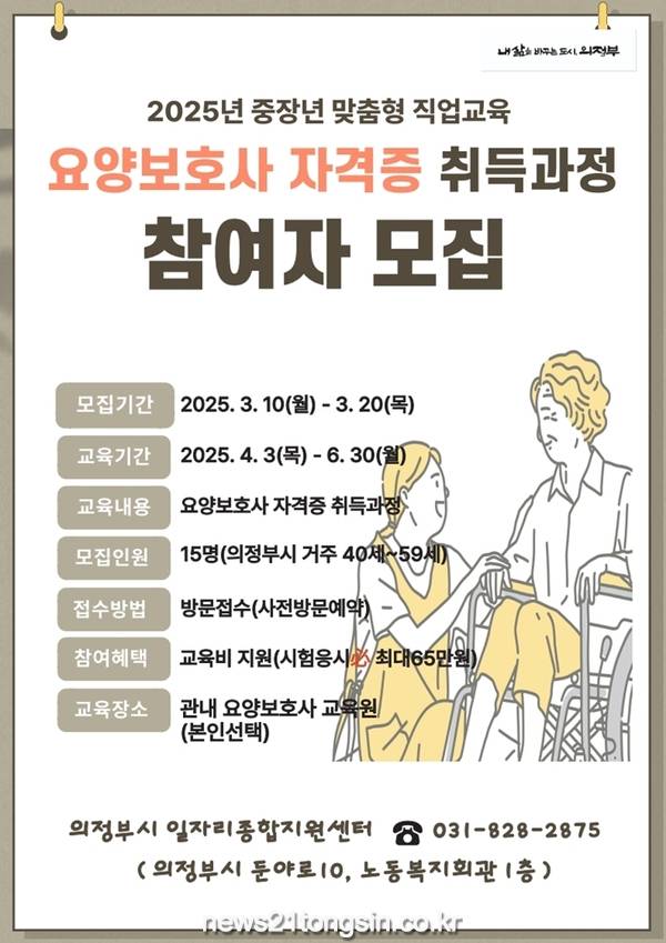 의정부시(시장 김동근)는 구직자를 위한 맞춤형 직업교육 취업 프로그램 ‘요양보호사 자격증 취득 과정’의 참여자를 모집한다.