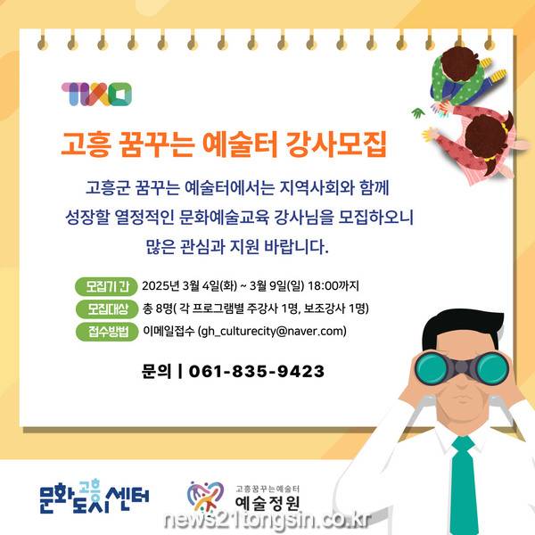 고흥군(군수 공영민)과 고흥군 문화도시센터(센터장 서성훈)는 2025년도 고흥 꿈꾸는예술터 상반기 문화예술교육 프로그램을 함께 운영할 우수한 강사를 오는 9일까지 모집한다고 밝혔다.
