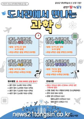 (뉴스21통신/홍미희기자) = 4일부터 국립대구과학관과 함께하는 ‘도서관에서 만나는 과학’, 11일부터 홍익대학교와 함께하는 ‘나는 그림책 작가’ 프로그램 접수를 진행한다고 달성군립도서관(관장 김영선)은 밝혔다.