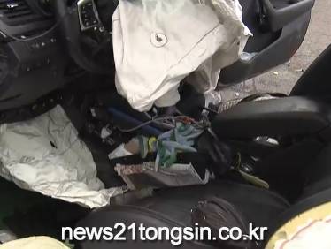 앞 유리는 심하게 부서졌고, 운전석과 조수석 에어백도 터져 있다.