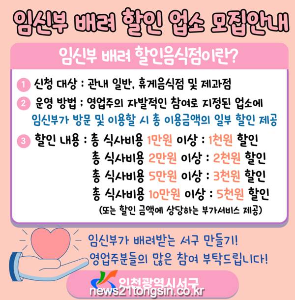 인천 서구(구청장 강범석)는 임신부를 대상으로 ‘임신부 배려 할인음식점’에 참여할 음식점을 상시 모집한다고 6일 밝혔다.