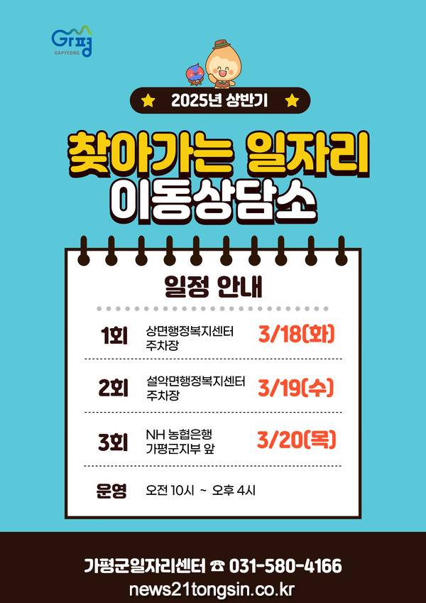 올해 상반기 이동상담소는 △18일 상면행정복지센터 주차장 △19일 설악면행정복지센터 주차장 △20일 NH농협은행 가평군지부 정문에서 총 3회 운영된다. 하반기에는 읍면별로 6회 추가 운영할 예정이다.