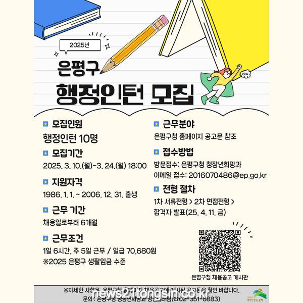 근무 시간은 주 5일 하루 6시간이며, 급여는 올해 은평구 생활임금인 일급 70,680원 수준으로 지급될 예정이다.