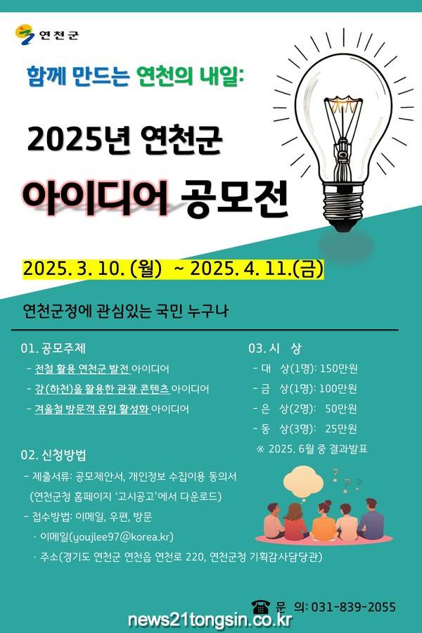 연천군은 오는 4월 11일까지 ‘함께 만드는 연천의 내일: 2025년 테마형 아이디어 공모전’을 개최한다고 11일 밝혔다.