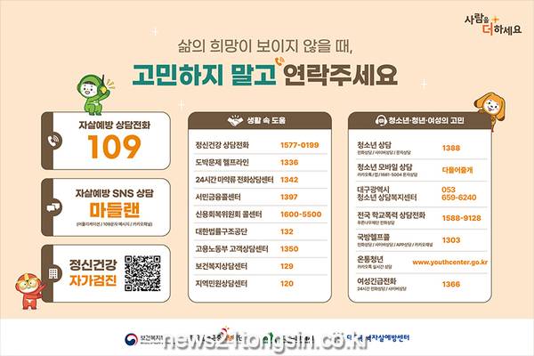 자살 고위험 시기 동안, 대구시는 자살예방 상담전화(☎109)와 정신건강 상담전화(☎1577-0199)를 다양한 채널로 홍보해 시민들에게 즉각적인 도움을 받을 수 있는 정보를 제공할 계획이다.